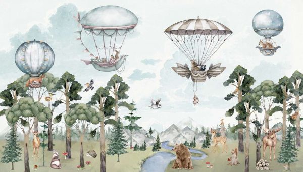 Un paysage montagneux ludique où des animaux se promènent entre les arbres et volent dans des montgolfières fantaisistes. Plein de couleurs, d'aventures et de détails joyeux dans une atmosphère fraîche et rêveuse.