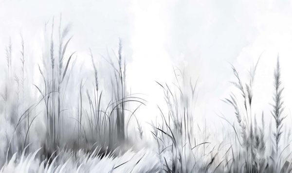 Des herbes à plumes ondulantes dans des teintes de bleu doux dansent dans le vent contre un fond clair. La technique aquarelle raffinée et les coups de pinceau subtils donnent au design une apparence fraîche et apaisante, parfaite pour un environnement serein et élégant.