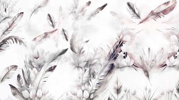 Un design élégant et raffiné où des plumes délicates et de douces fleurs se rencontrent dans un style aquarelle. Les teintes de taupe, de violet doux et de gris créent une atmosphère calme et rêveuse. La composition aérienne et les coups de pinceau subtils donnent une apparence légère et élégante, parfaite pour une ambiance sereine.