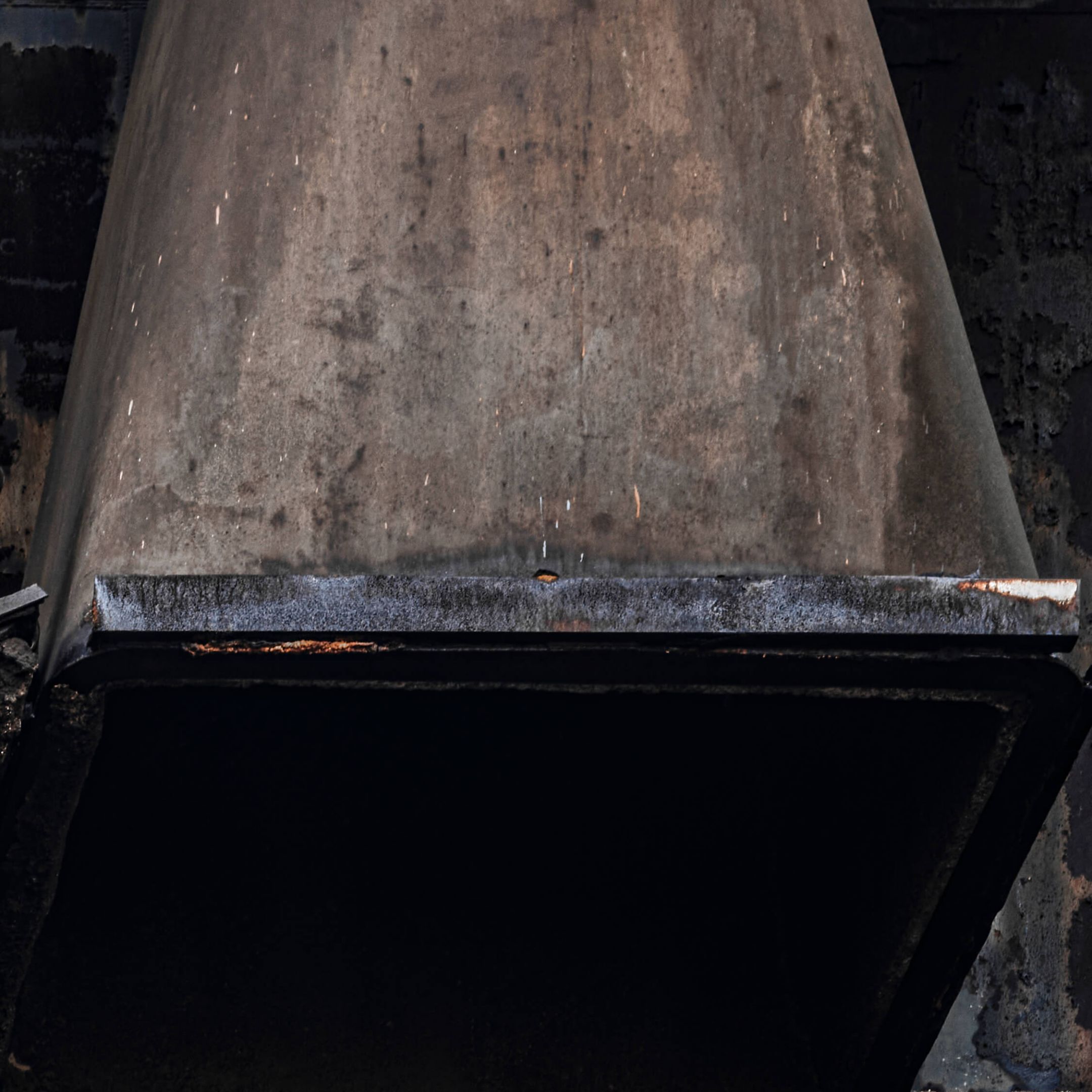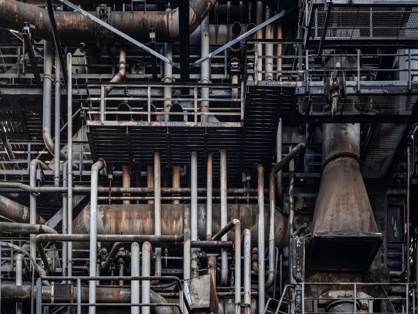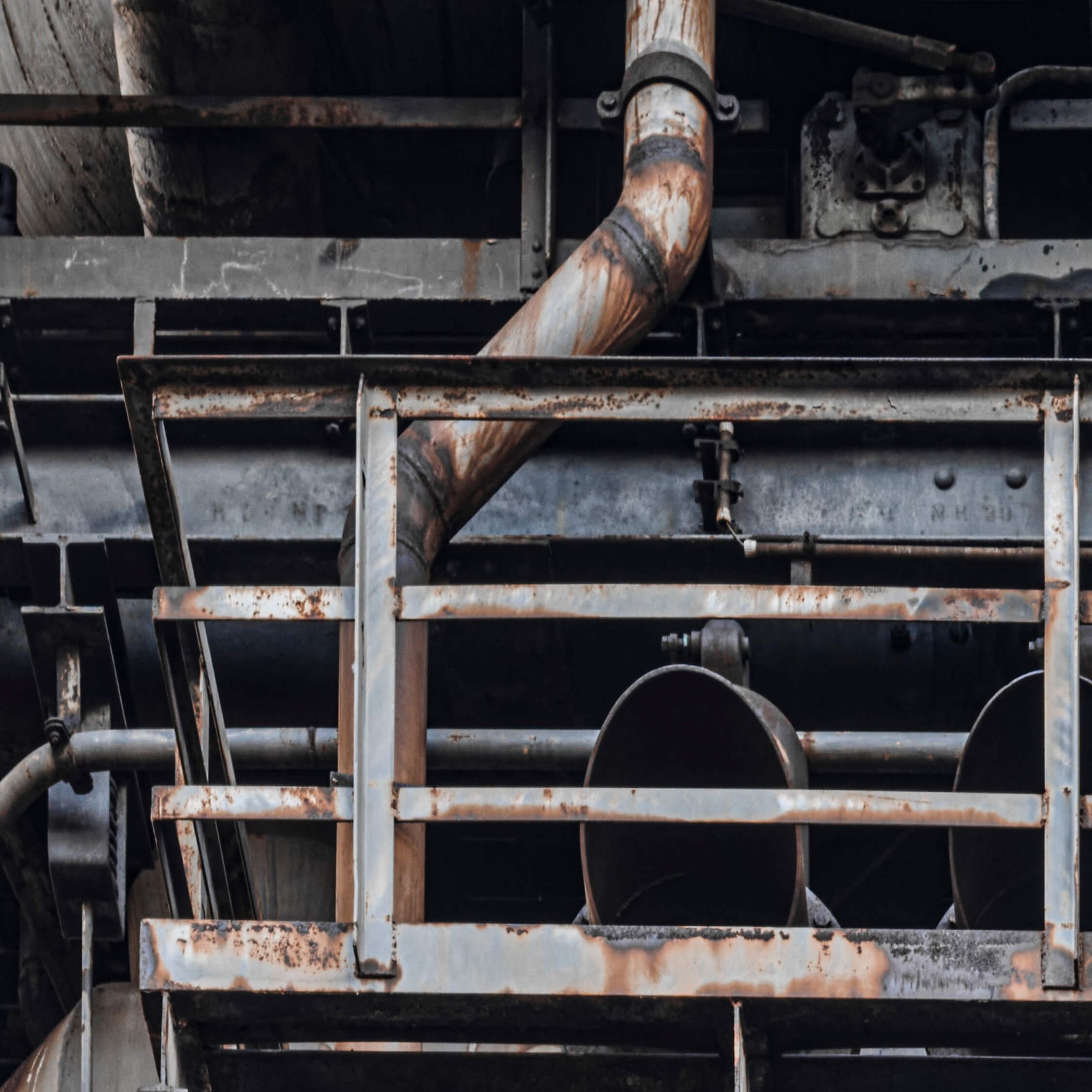 Ancienne usine industrielle abandonnée avec des éléments rouillés.