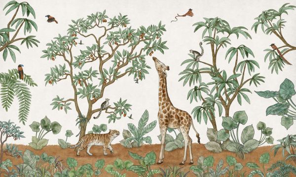 Une élégante girafe parmi des plantes exotiques, entourée d'un tigre, d'oiseaux et de lémuriens. Le style doux et dessiné à la main ainsi que l'utilisation naturelle des couleurs vert, marron et sable créent une atmosphère calme et tropicale avec une touche d'aventure.
