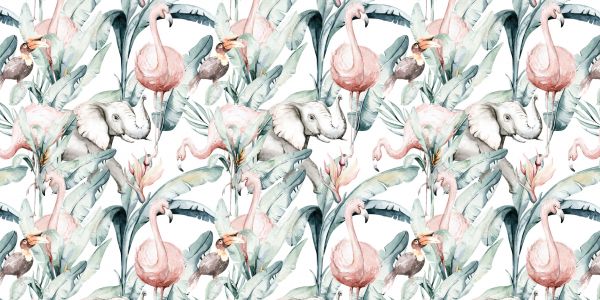 Un motif avec des flamants roses, un éléphant et un oiseau entre des feuilles tropicales.