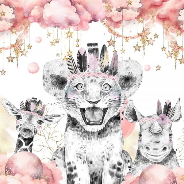 Un lionceau espiègle, une girafe curieuse et un rhinocéros joyeux se tiennent ensemble sous un ciel magique rempli de nuages roses et d'étoiles scintillantes. La combinaison d'illustrations en noir et blanc avec des teintes pastel douces et des accents dorés donne à ce design une apparence rêveuse et imaginative.