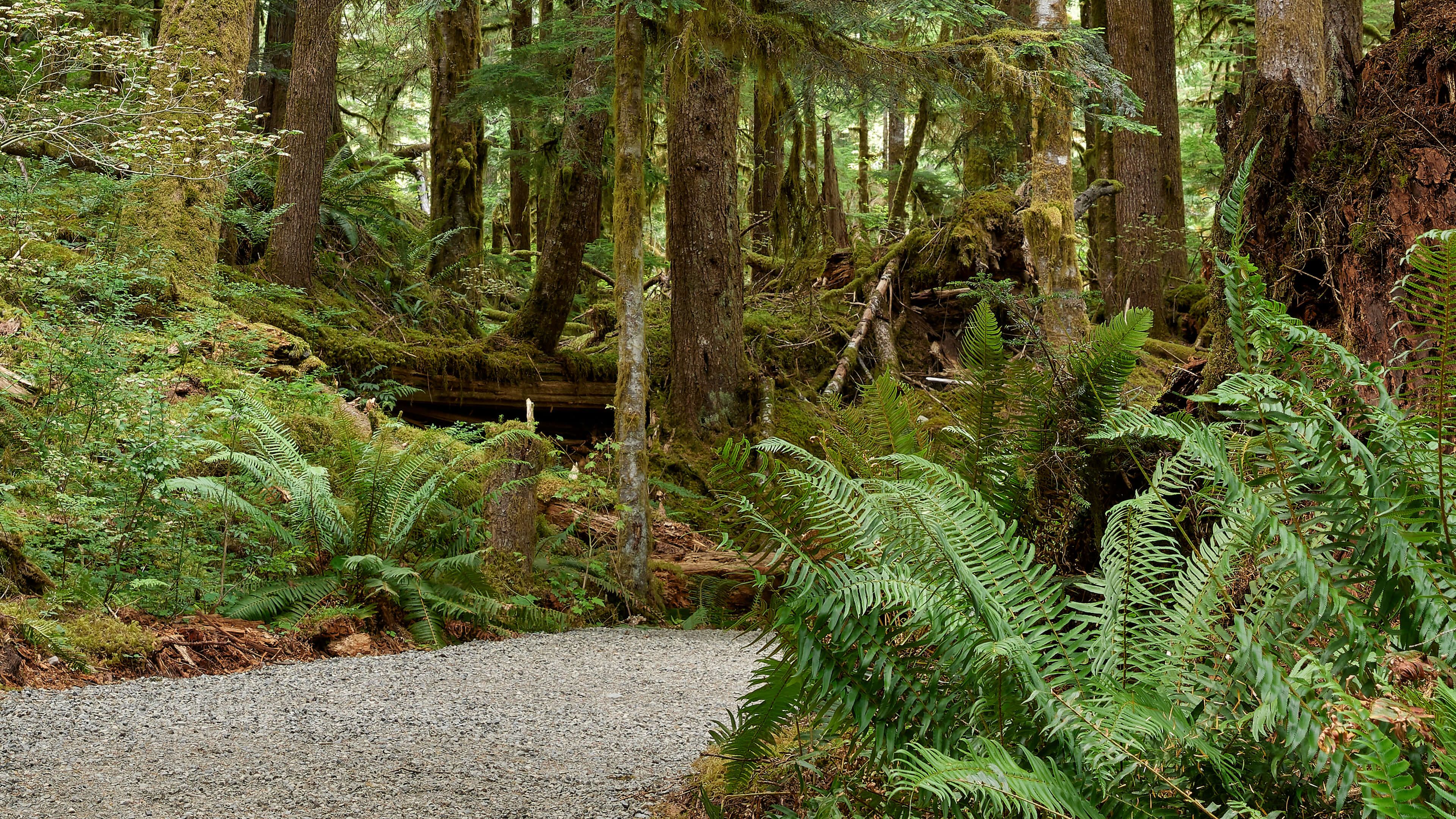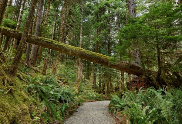 Arbre détaillé tombé avec un chemin de pierres en dessous.