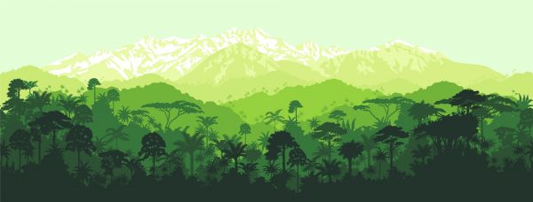 Illustration verte avec des arbres et des plantes. On peut voir de hautes montagnes enneigées en arrière-plan.