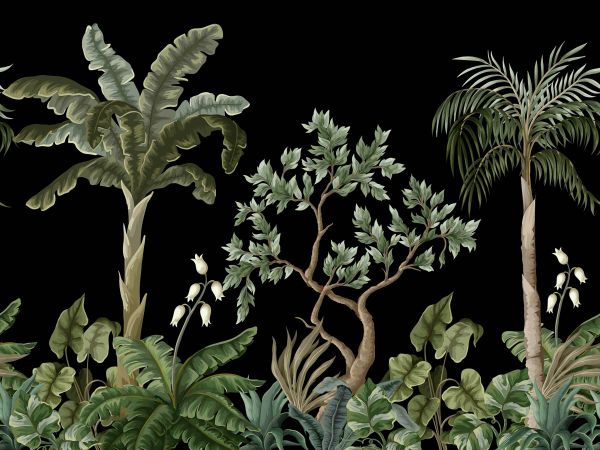 Papier peint panoramique d'un paysage de jungle avec des palmiers. Combinez ce papier peint dans la chambre à coucher, par exemple.