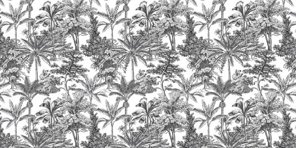 Arbres tropicaux dessinés en noir et blanc avec notamment des palmiers et des bananiers.