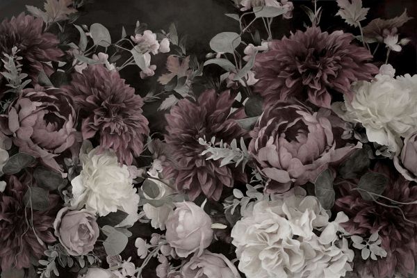 Un design floral riche et mystérieux avec de somptueuses dahlias et roses dans des teintes de violet profond et de crème. L'arrière-plan sombre renforce l'aspect dramatique, tandis que l'interaction des feuilles et des pétales évoque une atmosphère luxueuse et sereine. Un choix intemporel avec une touche d'élégance.