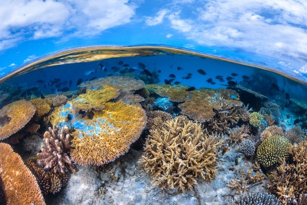 Une photo d'un récif corallien, où l'on peut regarder au-dessus et au-dessous de l'eau. Cela donne à la photo un effet de rondeur.