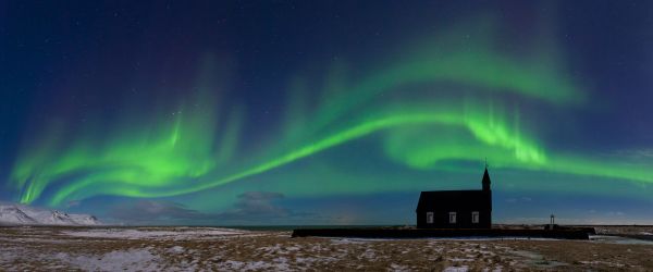 Papier Peint Panoramique Aurore boréale au-dessus d'une église