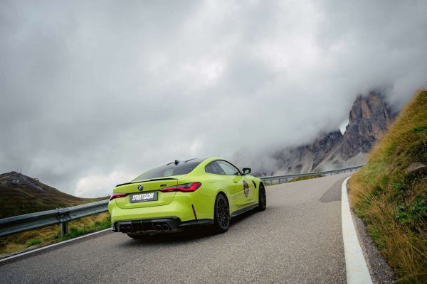 Un voyage vers le sommet – c'est le sentiment que cette image dégage. Un coupé sportif vert vif grimpe un col de montagne sinueux, entouré d'un paysage montagneux imposant enveloppé d'un voile de brume. La combinaison de performances puissantes et de nature sauvage donne à l'image une énergie indéniable. Les sombres pics rocheux émergent de manière menaçante des nuages, tandis que la route se fraye élégamment un chemin à travers les hauteurs imprévisibles.