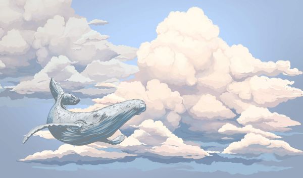 Baleine volant à travers les nuages avec une lueur bleue. Combinez ce papier peint dans une chambre d'enfant.
