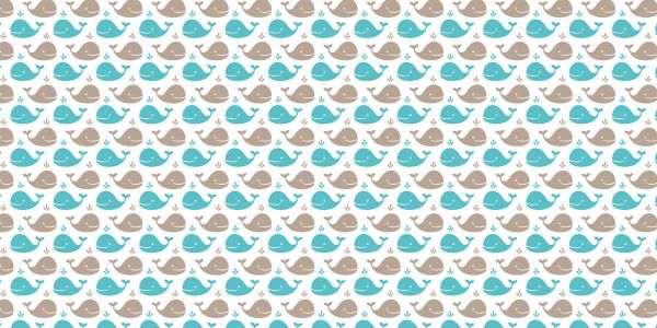 Papier peint avec un motif de baleines bleues et brunes sur fond blanc