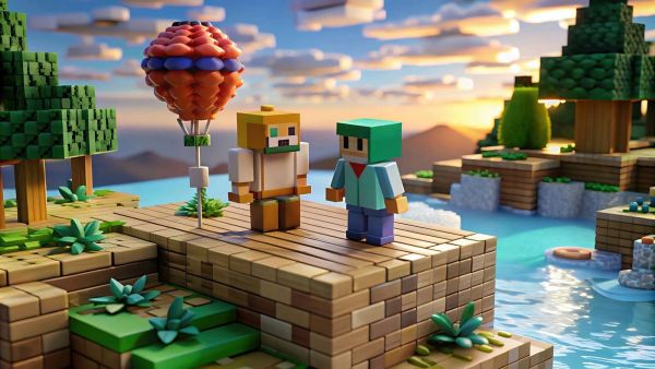 Ce design vous emmène dans un monde pixelisé tropical, où l'aventure et le calme se rencontrent. Deux personnages colorés se tiennent sur une plateforme en bois, entourés d'une végétation luxuriante et d'un lac cristallin. Une montgolfière frappante ajoute une atmosphère ludique et aventureuse à l'ensemble, tandis que le coucher de soleil chaud baigne la scène de douces teintes dorées et orange. La combinaison d'éléments naturels, tels que l'eau bleu clair et les arbres en forme de blocs verts, avec des détails en bois chaleureux crée une atmosphère harmonieuse et accueillante. Ce design s'intègre parfaitement dans des espaces où une ambiance calme et imaginative est souhaitée, comme les chambres, les espaces de travail créatifs ou les coins de jeu. Associez ce design à des teintes de bois naturel dans les meubles et les accessoires qui renforcent les couleurs chaudes du coucher de soleil. Ajoutez des décorations telles que des montgolfières colorées ou des détails de plantes pour accentuer davantage l'apparence ludique. Le design évoque un sentiment de liberté, de découverte et de joie, ce qui en fait un choix parfait pour les amateurs de mondes pixelisés sereins et vivants.