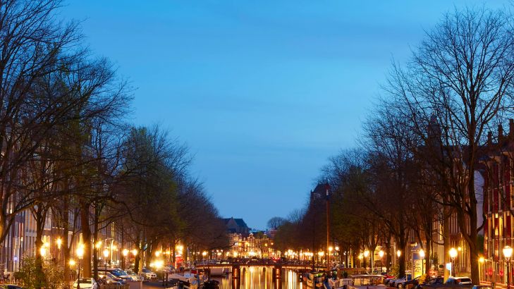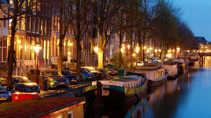 Bateaux fluviaux le long d'un canal éclairé à Amsterdam