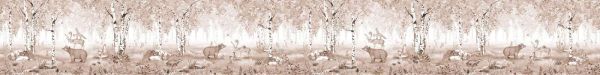 Un paysage forestier chaleureux dans des teintes sépia chaudes, avec des ours, des cerfs, des blaireaux et des lapereaux entre des bouleaux élancés et une dense canopée de feuilles. Intemporel, doux et naturel.