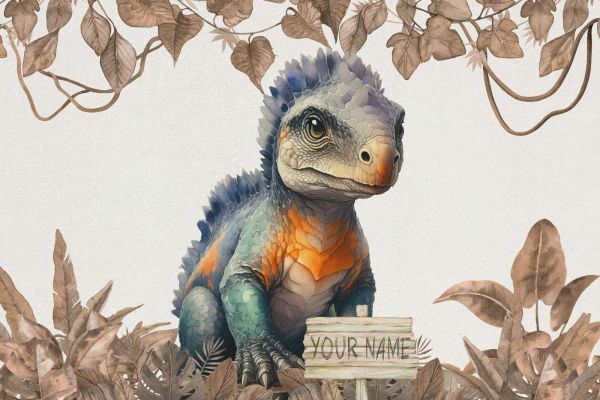 Un bébé ankylosaure dans une jungle couleur taupe. Disponible aussi avec le nom de votre enfant !