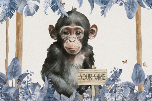 L'image représente un adorable bébé chimpanzé, entouré de plantes et de fleurs luxuriantes et de papillons volants. Le fond clair contraste subtilement avec le pelage foncé du chimpanzé, tandis que les fleurs et les feuilles bleues créent une scène naturelle et relaxante.