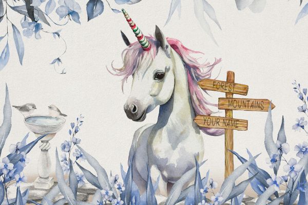 Cette image capture la magie d'un bébé licorne dont la crinière colorée et tourbillonnante semble danser au gré du vent. Entourée d'un champ de plantes fleuries dans les tons bleus et d'oiseaux curieux, la licorne apporte une atmosphère de conte de fées à n'importe quel décor.