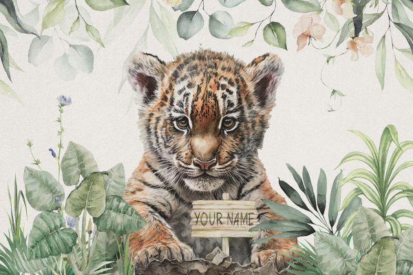 Ce design présente une scène charmante et captivante d'un jeune tigre, illustré de manière adorable, au milieu d'un feuillage tropical luxuriant. Le tigreau, avec son expression curieuse et ses grands yeux, tient un petit panneau en bois personnalisable, ajoutant une touche personnelle et unique à l'illustration. Entouré de feuilles vertes délicatement dessinées, ce motif évoque une atmosphère douce et naturelle, parfaite pour divers espaces intérieurs.