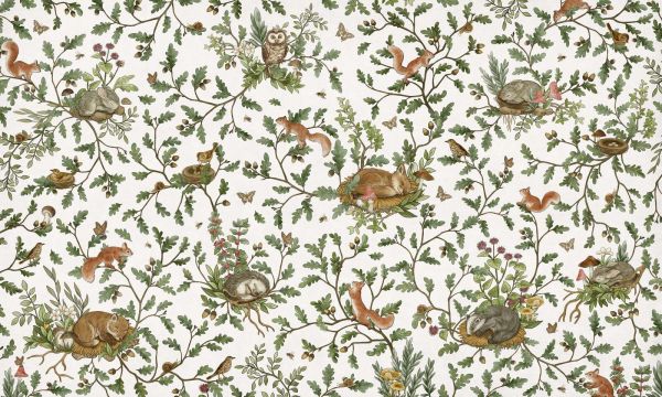 Dans cette conception vivante, le calme et la nature se rejoignent de manière ludique. Entre les feuilles de chêne vert frais et les branches de glands et de fleurs des champs, vous trouverez une joyeuse compagnie d'animaux de la forêt : des lapins qui dorment sur des lits de mousse, des écureuils qui gambadent à travers les branches, un hibou qui monte la garde, et des oiseaux chanteurs dans des nids douillets. L'arrière-plan clair met en valeur chaque détail de manière lumineuse et confère à la conception une apparence ouverte et amicale. La combinaison de couleurs naturelles de vert doux, brun chaud, beige et ocre est rafraîchie par la base claire. Cela donne à la conception un aspect à la fois ludique et intemporel. Idéal pour une chambre d'enfant naturelle, une chambre de bébé lumineuse ou même un hall ou un coin lecture ludique. Grâce à sa structure calme mais détaillée, il reste visuellement attrayant sans être trop chargé. Les illustrations sont dessinées à la main, avec une attention particulière pour les détails fins : papillons, abeilles, escargots, fleurs et même de petites champignons créent un monde riche et imaginatif. La composition ouverte donne à la conception une sensation aérienne, tandis que la structure répétitive des branches crée un équilibre et un rythme. Cette conception se marie magnifiquement avec des meubles en bois clair, en rotin ou blanc. Les accessoires dans des tons naturels tels que crème, sable, terracotta ou vert sauge renforcent le caractère doux. Ajoutez des tissus doux, un mobile en feutre ou des figurines d'animaux en bois pour une pièce pleine de calme, d'émerveillement et de fantaisie.
