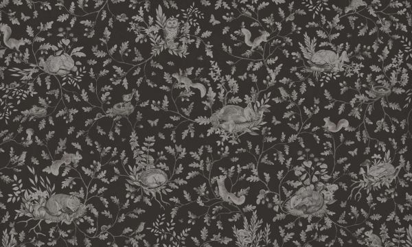 Ce design capture l'atmosphère magique de la forêt lorsque la nuit tombe. Sur un fond noir profond se déploie une scène détaillée et silencieuse : des lapins qui dorment en toute sécurité sur un lit de feuilles, des écureuils cachés entre les branches, des oiseaux dans leurs nids et une chouette sage qui observe depuis sa branche. Des branches de chêne avec des feuilles et des glands serpentent à travers l'image, encadrées de fleurs, de papillons et de petits détails forestiers dans des tons de gris doux. La palette de couleurs limitée et monochrome rend ce design puissant et serein. Le contraste entre le fond noir et les animaux et plantes finement travaillés en nuances de gris crée une profondeur subtile mais frappante. Cela le rend parfait pour un intérieur rustique moderne, ou comme un accent ludique dans une chambre d'enfant sombre et confortable. Les animaux dorment paisiblement ou veillent tranquillement, donnant au motif une allure calme. Le style illustratif semble être dessiné à la main, avec beaucoup d'attention aux détails, donnant à l'ensemble l'impression de raconter une histoire - silencieuse, douce et réconfortante. La répétition des branches de chêne crée un rythme, tandis que la variété des animaux et des plantes maintient le design vivant. Idéal pour les espaces où vous souhaitez créer une atmosphère chaleureuse et réconfortante : une chambre à coucher, un coin lecture, un coin de jeu ou même un espace de travail créatif. Associez ce design à des gris chauds, des verts profonds, des accents de bois et des textures douces comme la laine ou le velours pour un ensemble riche et accueillant. Également magnifique en combinaison avec des accessoires bleu nuit ou cuivrés pour une allure superposée supplémentaire.