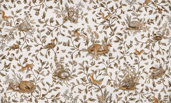 Le style d'illustration est raffiné et détaillé, avec une apparence douce dessinée à la main. Les branches de chêne apportent de la structure et du rythme, tandis que les animaux et les fleurs confèrent un caractère ludique mais équilibré. Le motif est riche, mais jamais chargé, et invite à rêver dans une forêt imaginaire pleine de vie.