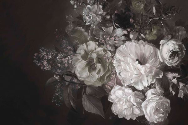 Un arrangement floral luxueux avec des roses, des pivoines et des fleurs en douces teintes de vert, rose poudré et crème, encadré par un fond profond et sombre. La lumière subtile et les coups de pinceau raffinés donnent à ce design une allure intemporelle et classique, parfaite pour une ambiance chaleureuse et élégante.