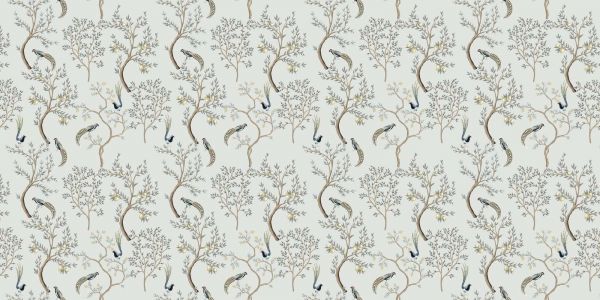 Ce design est une rencontre subtile de flore et de faune, où des faisans élégants se trouvent parmi des branches tendres et des fleurs douces. La palette de tons jaune doux et bleu-gris crée une apparence sereine et élégante, idéale pour une ambiance raffinée dans n'importe quel espace. Les courbes naturelles des branches et la disposition douce des fleurs assurent une harmonie fluide dans l'ensemble.