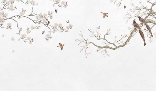 Papier Peint Panoramique Branches fleuries et oiseaux