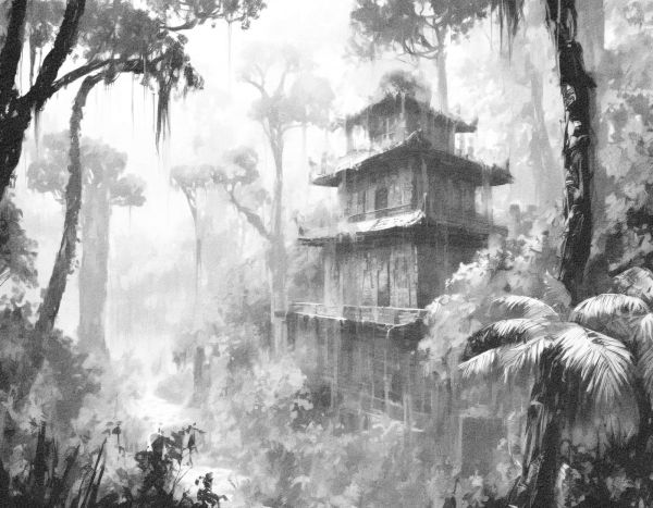 Ce design artistique révèle une cabane cachée dans une forêt dense et brumeuse. Entourée de grands arbres mystérieux et de mousses pendantes, ce dessin crée une sensation d'isolement et d'aventure.