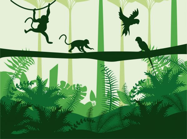 Une illustration verte avec des singes jouant dans une cage à singes.