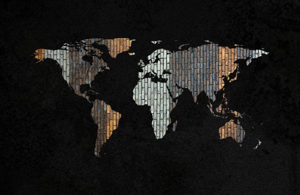 Carte du monde avec des briques de couleur verticales. Le fond noir fait ressortir la carte du monde.