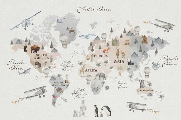 Les couleurs douces et les détails soigneusement dessinés créent une composition visuellement agréable et éducative. Les noms des océans et des continents sont élégamment inscrits, facilitant l'apprentissage et la reconnaissance géographique. Cette carte est idéale pour les chambres d'enfants, les salles de jeux ou les espaces éducatifs, inspirant la curiosité et l'amour du monde naturel.