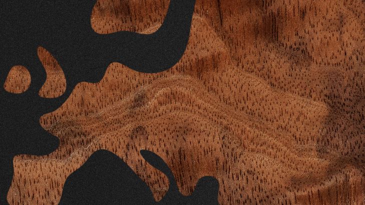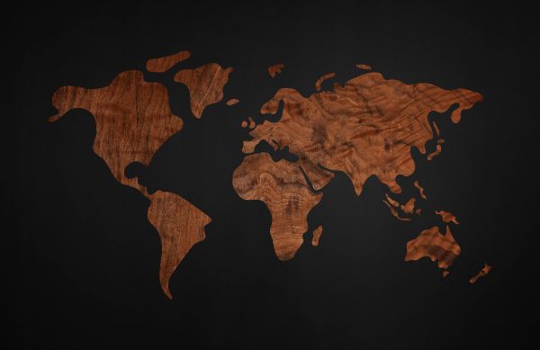 Belle carte du monde en placage de bois. Le fond noir fait ressortir la carte du monde de façon magnifique.