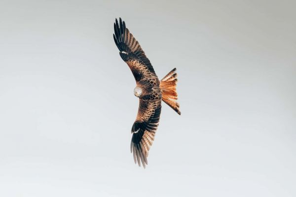 Cerf-volant rouge aux ailes déployées. La structure du plumage de ce rapace est clairement reconnaissable. Le ciel est clair et gris clair.