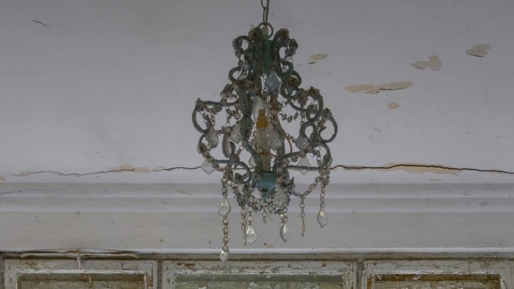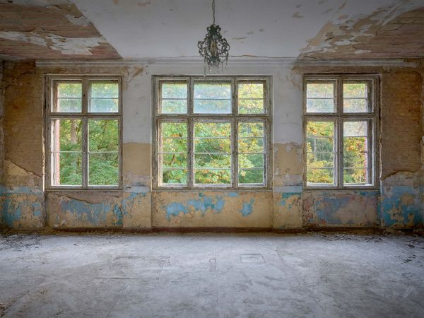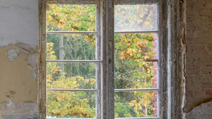 Vieille pièce abandonnée avec les vitres de la fenêtre brisées. Créez une atmosphère mystérieuse dans votre maison avec ce papier peint.