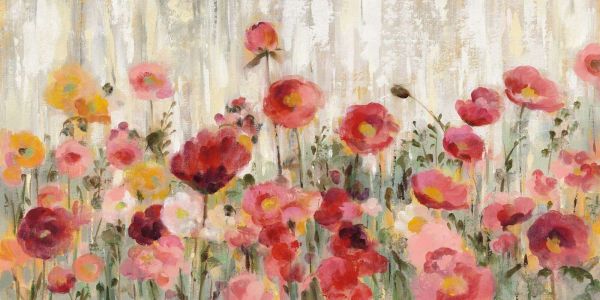 Un champ de fleurs vivant rempli de coquelicots dans des tons chauds de rouge, rose et jaune prend vie contre un arrière-plan doux et peint. Les coups de pinceau lâches donnent au design une atmosphère estivale rêveuse, pleine de mouvement et de couleur.