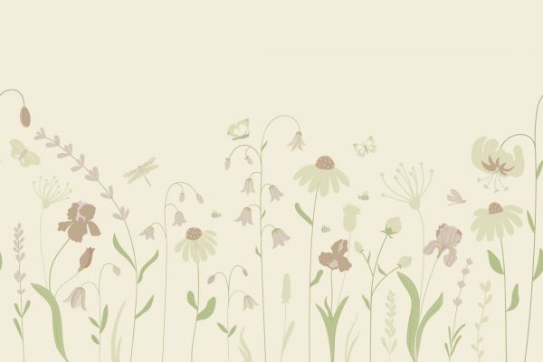 Champ de fleurs en hauteur avec différentes fleurs et insectes, tels que des papillons et des abeilles, dans différentes nuances de beige et de vieux rose Couleur : beige et vieux rose