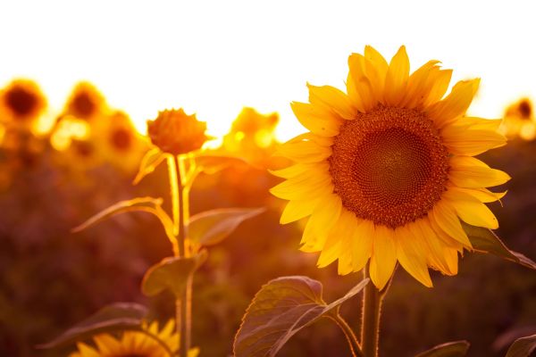 Gros plan d'un tournesol dans le soleil du soir en été. Un champ de tournesol chaud sur le papier peint.