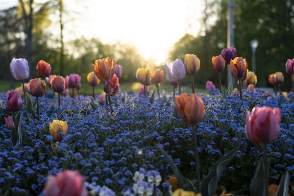Un joyeux champ de fleurs dans un parc avec des fleurs de différentes couleurs