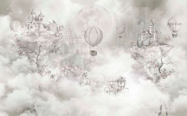 Une scène féerique en douces teintes d'argent et de gris, avec des dragons volants, des châteaux de rêve et des ballons entre des nuages flottants. Une licorne, des fleurs et une élégante calèche complètent et enchantent l'image.