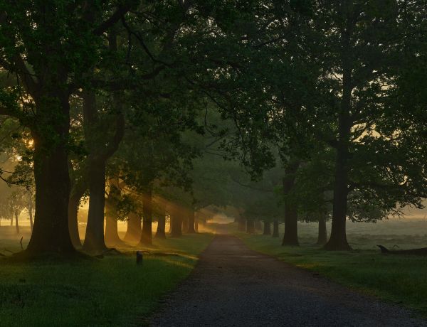 Beau chemin de lande avec des arbres et de la brume au lever du soleil. Les rayons du soleil sont déjà visibles au loin.