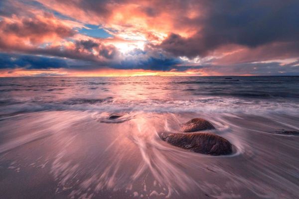 Ce design capture un moment magique où l'eau, l'air et la lumière se rencontrent en parfaite harmonie. Le ciel est rempli de nuages dramatiques, variant du gris foncé à l'orange intense et au rose, tandis que la douce lumière du soir danse à la surface de l'eau. Au premier plan, l'eau de mer s'écoule gracieusement sur le sable, laissant derrière elle des motifs striés, comme si le mouvement était figé dans le temps. Deux galets lisses forment un point d'ancrage puissant dans la composition, partiellement entourés par l'eau écumeuse. L'atmosphère de cette image s'intègre parfaitement dans un style d'intérieur coastal modern ou wabi-sabi. Dans un aménagement coastal modern, avec ses blancs frais, ses nuances de bleu doux et ses matériaux naturels, cette image constitue un point central captivant mais apaisant. Dans la philosophie wabi-sabi, qui valorise l'imperfection et la fugacité, la simplicité naturelle et les lignes fluides de l'eau qui se retire s'harmonisent parfaitement avec les accents en bois, la céramique et les textures patinées. Les tons de couleur dans ce design vont du bleu-gris profond et du vert marin aux couleurs chaudes de cuivre et de pêche. Cette combinaison apporte un mélange équilibré de calme et de drame dans l'espace. La dynamique des nuages et de l'eau donne à l'ensemble une stratification vivante, tandis que les pierres lisses expriment stabilité et tranquillité. Ce design s'épanouit le mieux dans les salons, les salles de bains ou un coin lecture tranquille, où il invite à la contemplation et à un sentiment de connexion avec la nature. C'est une image qui montre à la fois la force et la vulnérabilité du moment, enrichissant ainsi chaque espace d'une profondeur émotionnelle.