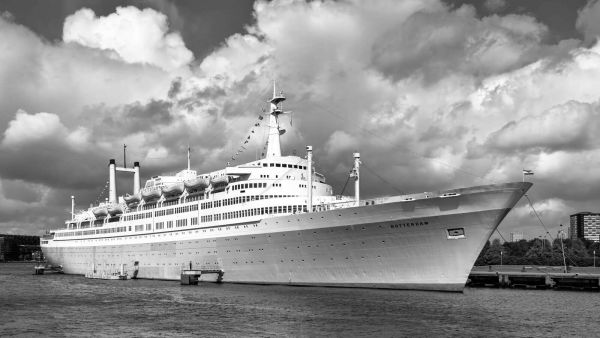 Ce design élégant en noir et blanc fait revivre la grandeur des navires océaniques avec un impressionnant paquebot majestueusement ancré dans le port. Les ciels nuageux dramatiques et le subtil jeu de lumière sur l'eau ajoutent de la profondeur et du caractère à la scène, tandis que les lignes détaillées du navire soulignent l'histoire nautique et l'élégance. L'absence de couleur renforce le sentiment intemporel et nostalgique, rendant ce design parfait pour un intérieur classique ou industriel.