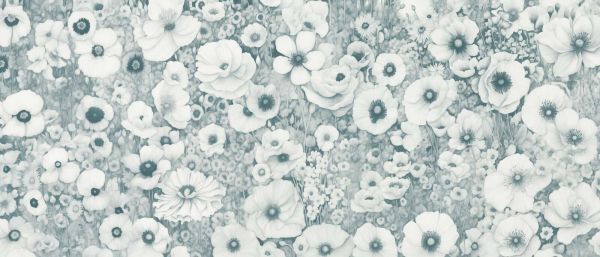 Une version rêveuse du champ de fleurs monochrome, accentuée par des teintes de bleu froid évoquant la profondeur de l'océan. Les coquelicots et les fleurs sauvages dégagent une élégance calme et rafraîchissante.