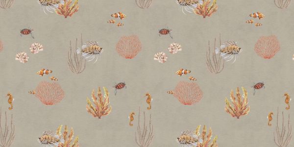 Un motif sous-marin apaisant avec des récifs coralliens colorés, des poissons tropicaux, des hippocampes et des tortues. L'arrière-plan brun doux et les illustrations détaillées créent une atmosphère maritime sereine, parfaite pour ajouter une touche relaxante et exotique à n'importe quel espace.