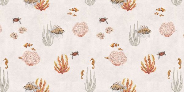Un motif sous-marin apaisant avec des récifs coralliens colorés, des poissons tropicaux, des hippocampes et des tortues. L'arrière-plan brun doux et les illustrations détaillées créent une atmosphère maritime sereine, parfaite pour ajouter une touche relaxante et exotique à n'importe quel espace.