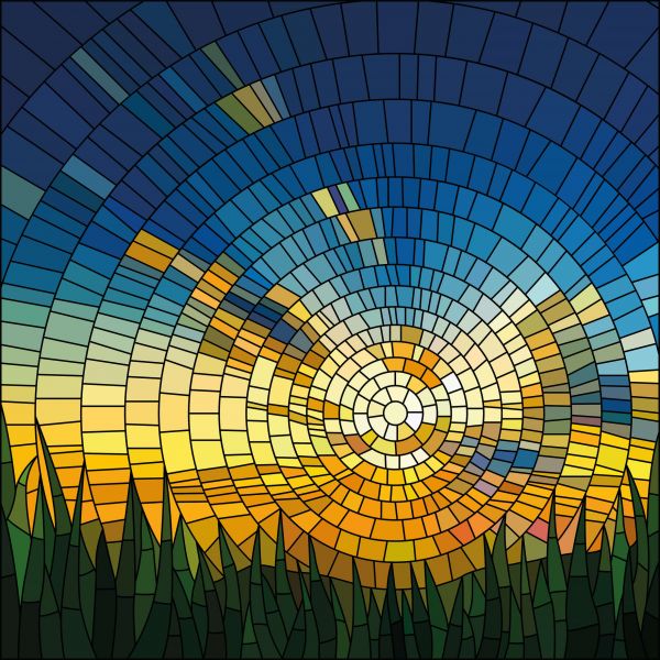 Un coucher de soleil au bord d'une pelouse en style mosaïque. Combinez ce papier peint dans votre maison et complétez la pièce.