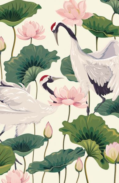 Un couple de grues entre les fleurs de lotus. Appliquez ce papier peint dans votre chambre ou votre salon.